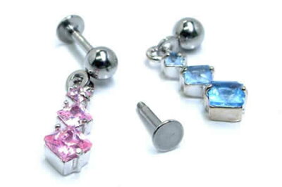 大きさの異なる3つのスクエアカットされたキュービックジルコニアをラブレットにセットしたロングチャームのボディピアスです。